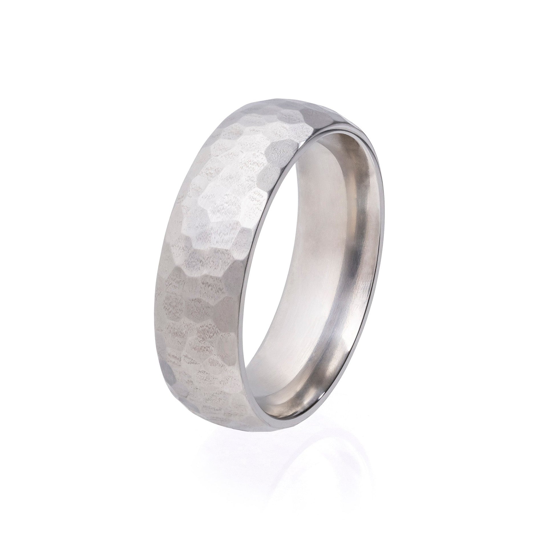For those who appreciate rugged elegance, The Hammered Horizon features a titanium band with a textured, hammered finish. Its lightweight, durable construction ensures it can handle whatever life throws your way, while the comfort-fit design offers unbeatable wearability. Perfect for the man who values resilience and individuality, this ring is as unique as your love. Find your horizon at Rockmarq.