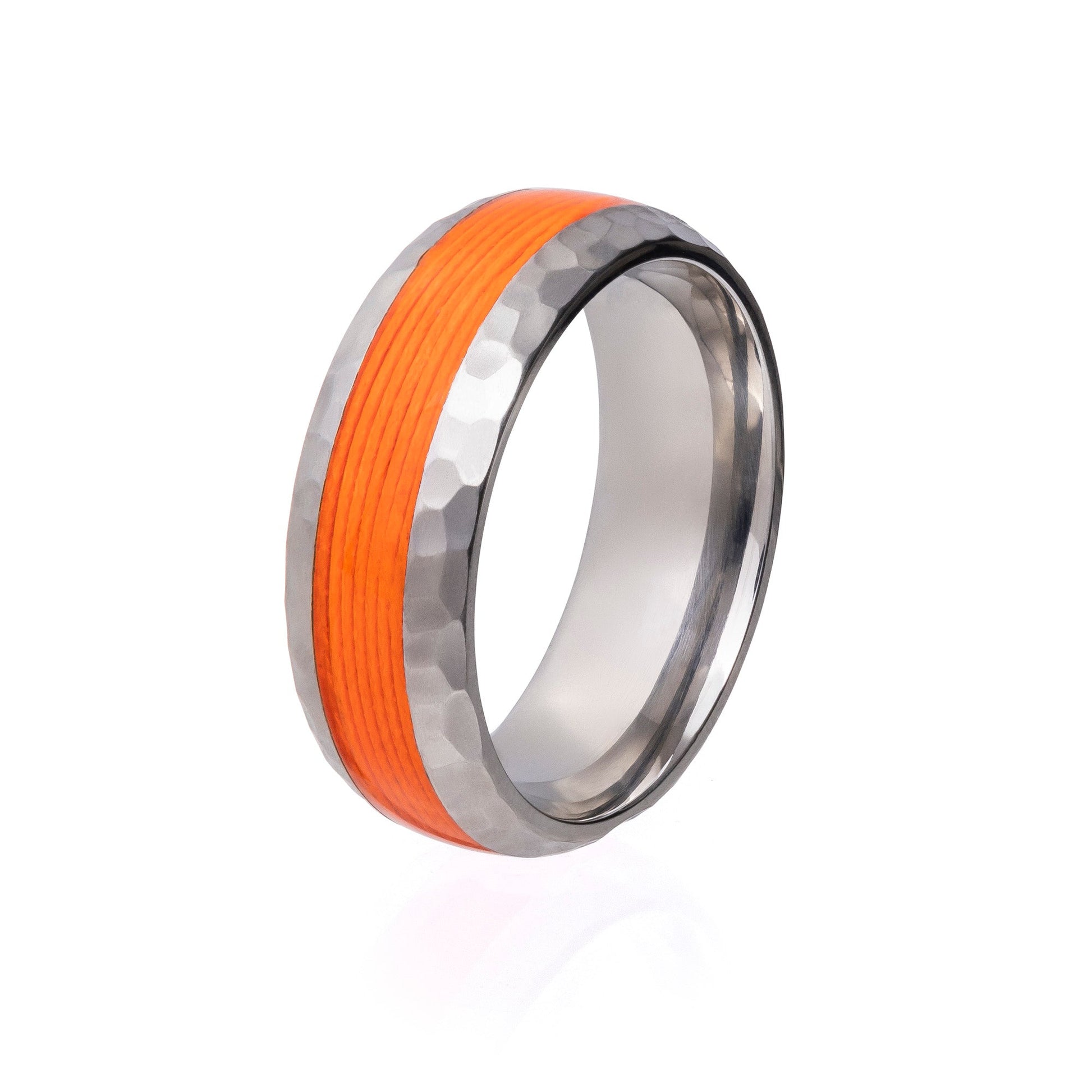 Wir präsentieren unseren 8 mm großen Titanring für Herren mit halbrundem Profil und einer einzigartigen 4 mm großen orangefarbenen Angelschnureinlage, die sorgfältig für robuste Eleganz gefertigt wurde. Dieser von erfahrenen Handwerkern handgefertigte Ring zeichnet sich durch eine hochwertige Titankonstruktion aus, die Haltbarkeit und leichten Komfort für den täglichen Gebrauch gewährleistet. Die gehämmerte Oberfläche verleiht Textur und Charakter, während die leuchtend orangefarbene Angelschnureinlage einen subtilen Farbtupfer bringt und ihn zu einem herausragenden Accessoire für Outdoor-Enthusiasten und Angelfreunde macht. Mit seinem bequemen Design und der maßgeschneiderten Handwerkskunst verbindet dieser maßgefertigte Ring nahtlos Stil mit Haltbarkeit und ist damit die perfekte Wahl für Männer, die bei ihren Accessoires unverwechselbare Eleganz zu schätzen wissen.